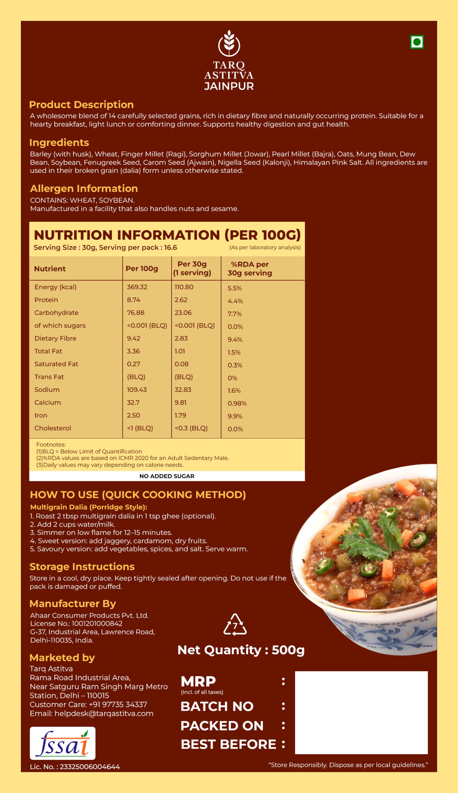 Made from a precise blend of 14 nutrient-rich ingredients—wheat, barley with husk, gram, finger millet, sorghum millet, oats, pearl millet, mung bean, dew bean, fenugreek seeds, nigella seeds, carom seeds, soybean and Himalayan salt—this multigrain dalia delivers balanced, everyday nourishment.